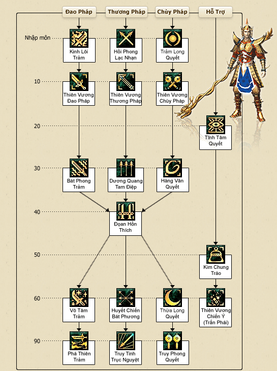 Một số chiêu thức của Thiên Vương Bang: Thiên Vương Thương pháp,Thiên Vương đao pháp, Bát Phong Trảm, Huyết Chiến Bát Phương, Truy Tinh Trục Nguyệt.